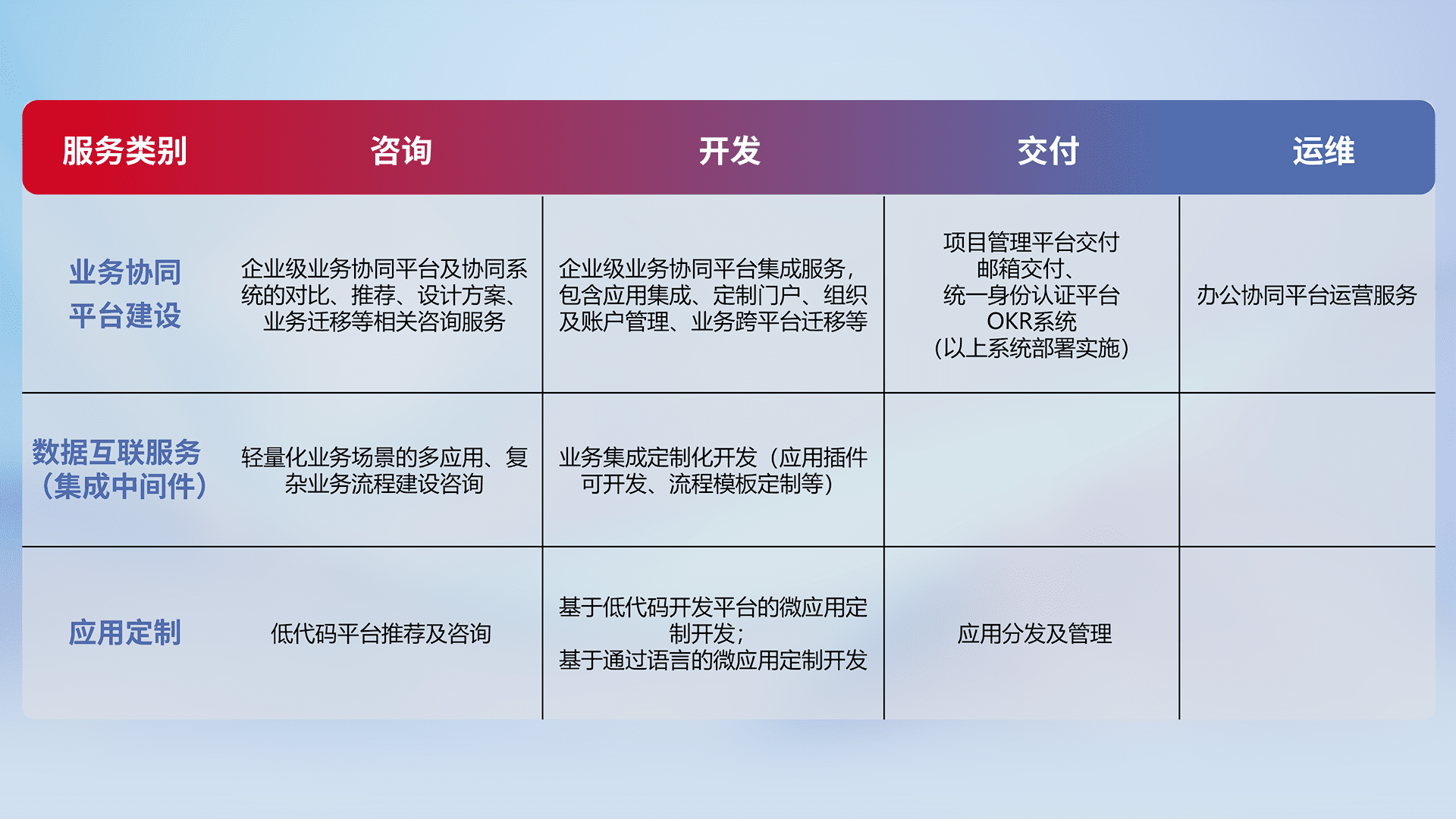 针对钉钉、、企微、、IDaas等平台级产品提供产品的规划、、、、方案、、、、交付、、、、定制化开发等服务,,,,实现如统一协同办公、、、智能客户服务、、、、混合会议管理、、、、智能数据查询、、等业务场景,,,,实现数字化转型。。。